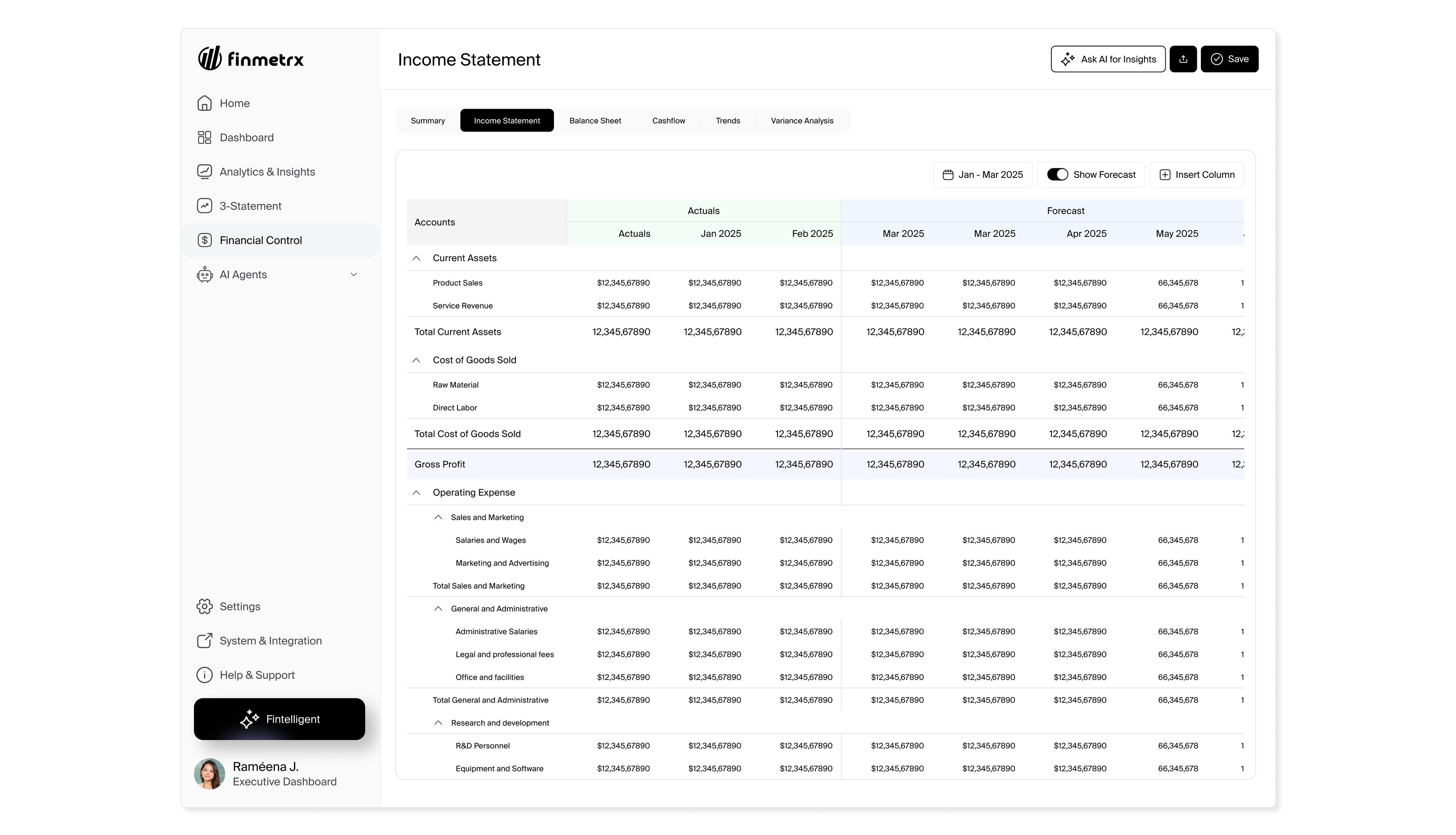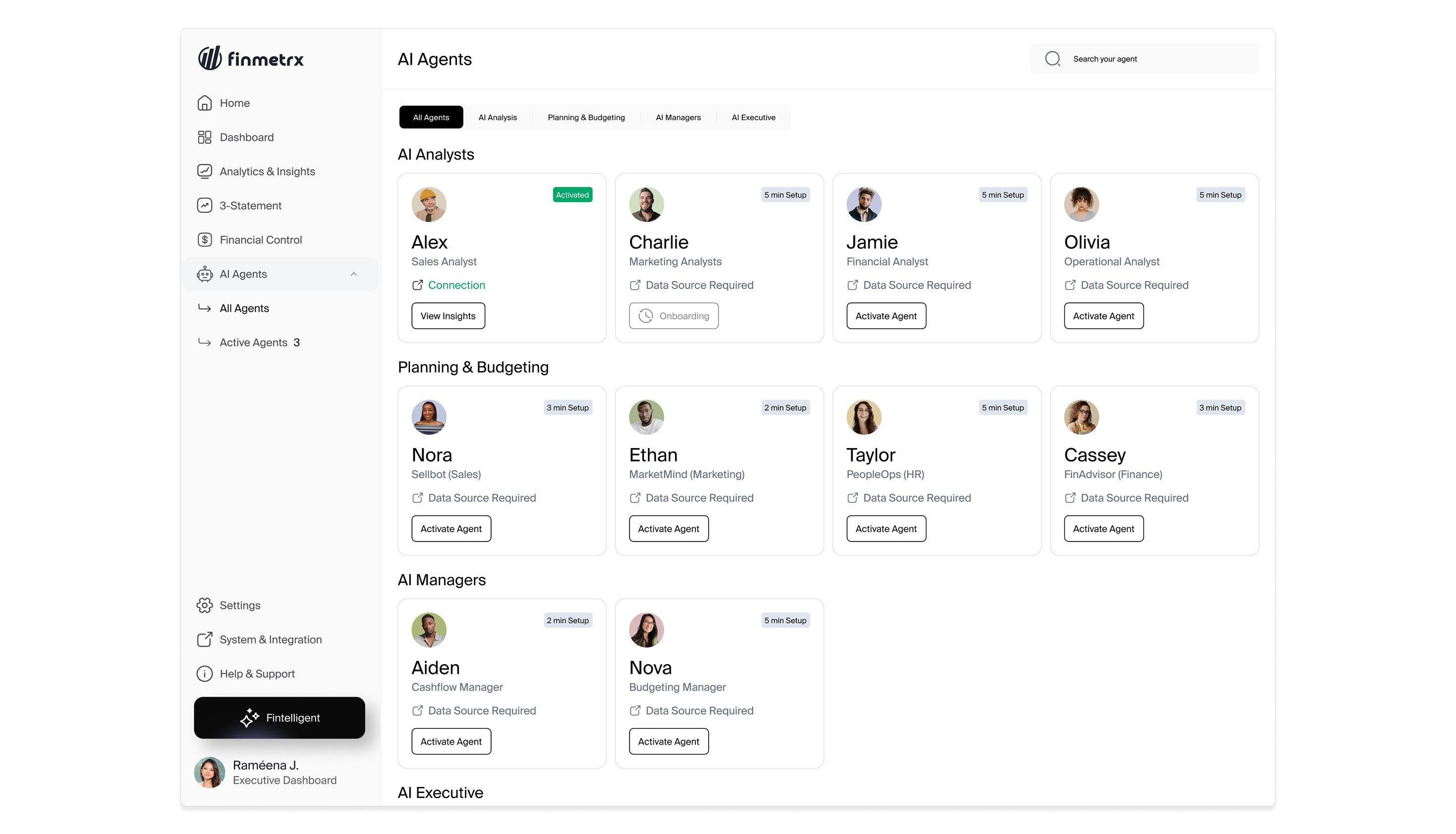 Finmetrx includes domain-specific AI agents designed to assist finance teams with analysis, planning, and monitoring. Agents are intentionally configurable to maintain transparency and trust.
